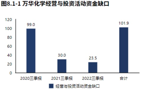 经营活动无资金缺口。万华化学2022三季报经营活动现金净流入199.44亿元,较2022三季报增加24.61亿元,万华化学经营活动账面盈利,给企业带来真金白银的流入也在增加。