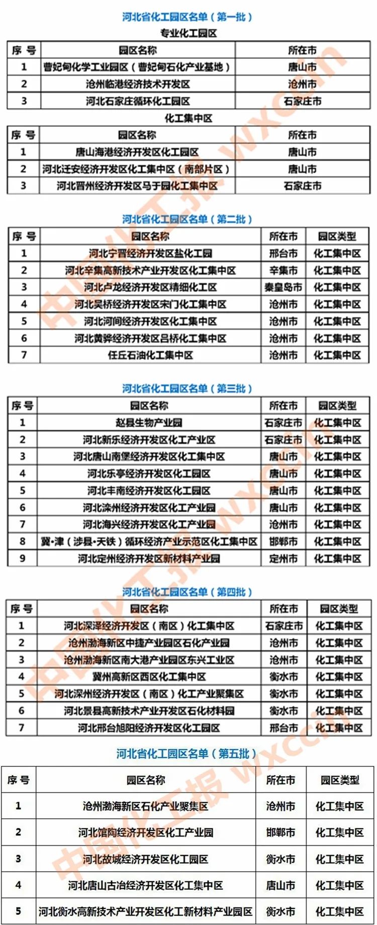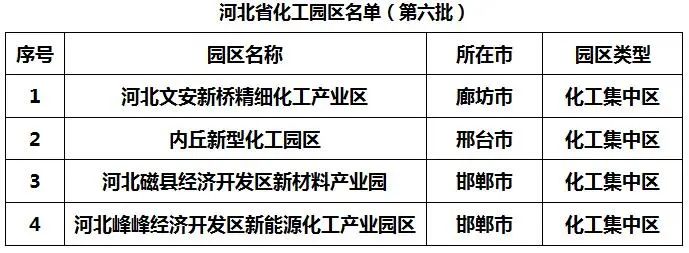 5月4日,河北省工信厅公布第六批化工园区名单,所公布的4家园区均为化工集中区。