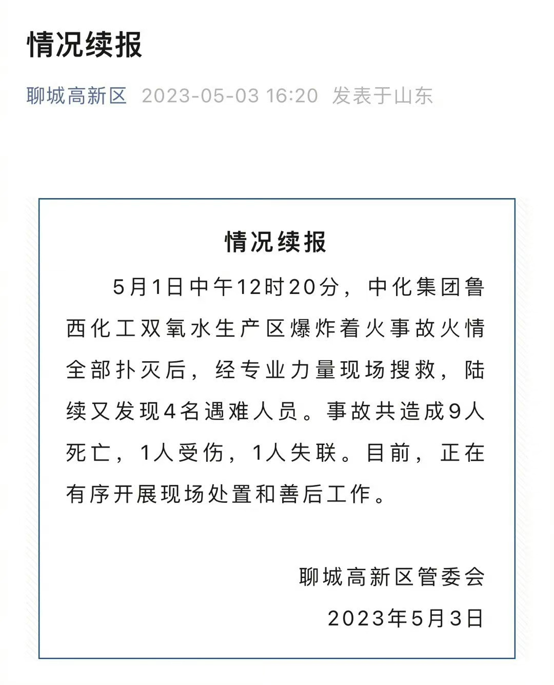 【#山东化工厂爆炸致9人死亡#,1人受伤,1人失联】#官方通报山东化工厂爆炸事故# 山东聊城高新区管委会3日继续通报:5月1日中午12时20分,中化集团鲁西化工双氧水生产区爆炸着火事故火情全部扑灭后,经专业力量现场搜救,陆续又发现4名遇难人员。事故共造成9人死亡,1人受伤,1人失联。#山东化工厂爆炸致9死1伤1失联#(聊城高新区)