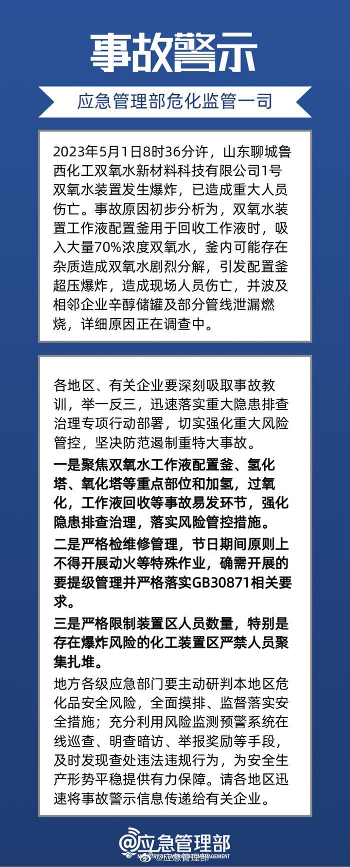 据应急管理部官方微博消息,5月1日,山东聊城中化集团鲁西化工双氧水生产区发生爆炸火灾事故,造成5人死亡、1人受伤,另有1名失联人员。应急管理部紧急发布事故警示,要求各地区、有关企业要深刻吸取事故教训,举一反三,迅速落实重大隐患排查治理专项行动部署,切实强化重大风险管控,坚决防范遏制重特大事故。