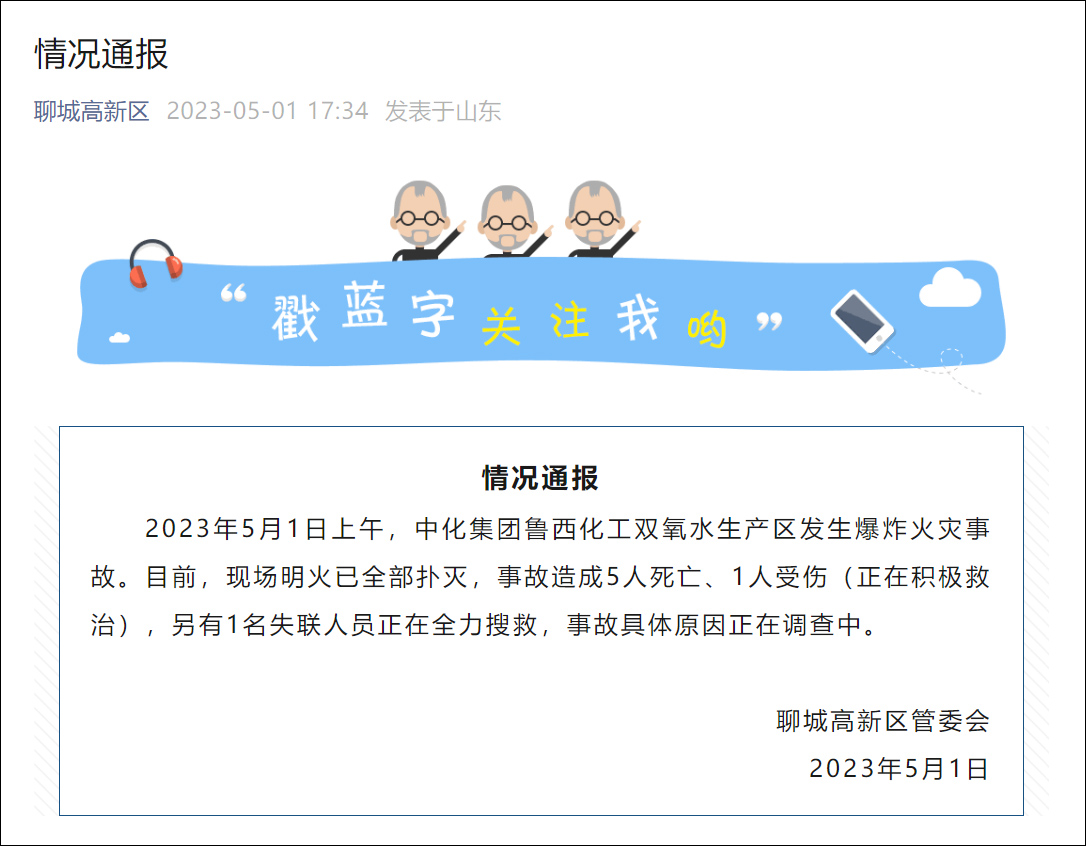 据微信公众号“聊城高新区”5月1日消息,山东聊城高新区管委会发布情况通报:2023年5月1日上午,中化集团鲁西化工双氧水生产区发生爆炸火灾事故。目前,现场明火已全部扑灭,事故造成5人死亡、1人受伤(正在积极救治),另有1名失联人员正在全力搜救,事故具体原因正在调查中。