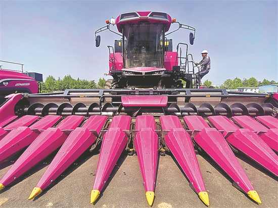 4月26日,在山东省临沂市临沭县一家农机企业,工人在调试机械。